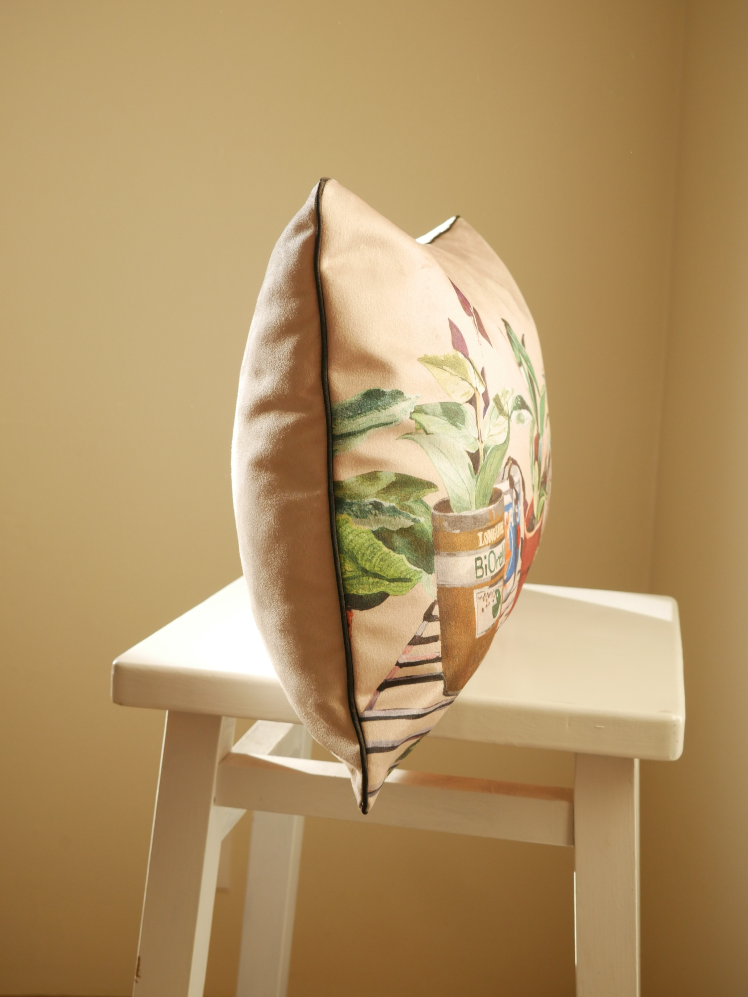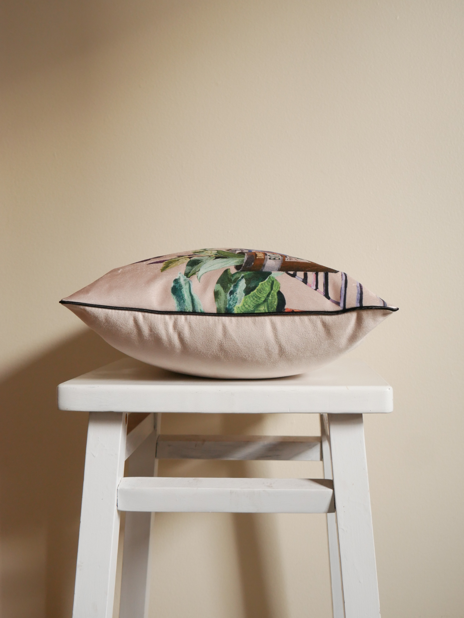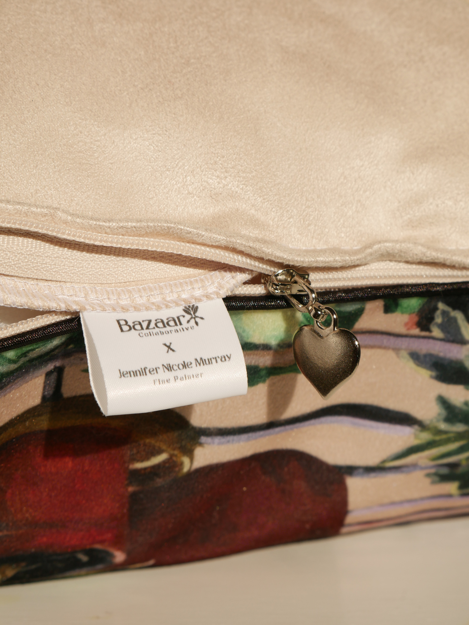 Bring nature's beauty home with Jennifer Murray's detailed botanical print on velvet. Framed with black piping with a warm tan suede backing. Finished with a charming heart zipper.
