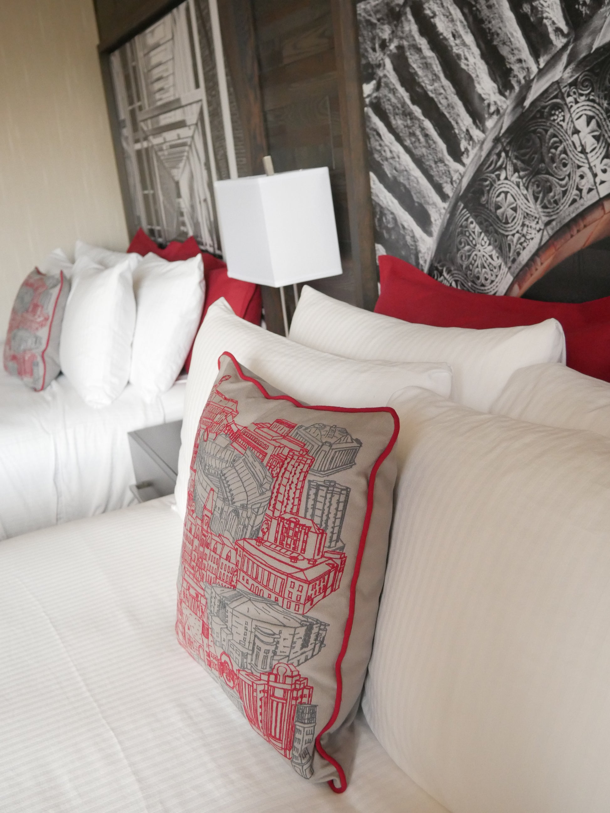 This product was created in collaboration with Ohio State’s Blackwell Inn and Conference Center, where it is featured on every hotel bed as part of an immersive Ohio State art experience. It is also showcased at the Graduate by Hilton Columbus.