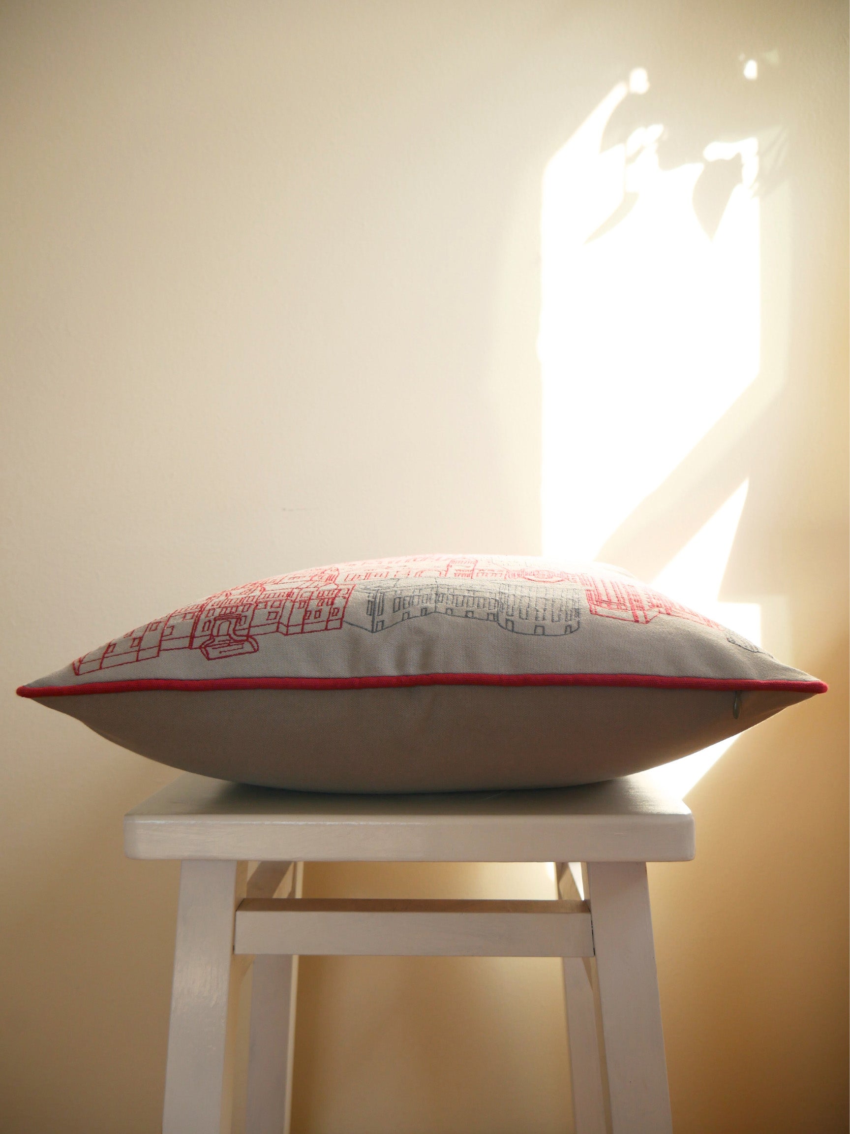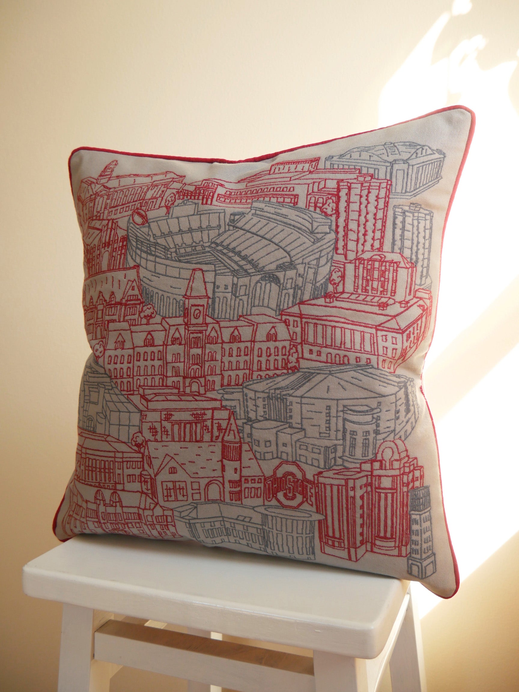 This piece features an architectural collage of all the iconic buildings on Ohio State's campus - including The Shoe, The Schott, Thompson Library, and all the classics. See if you can spot them all! Brought to life through a satin-stitch embroidery.