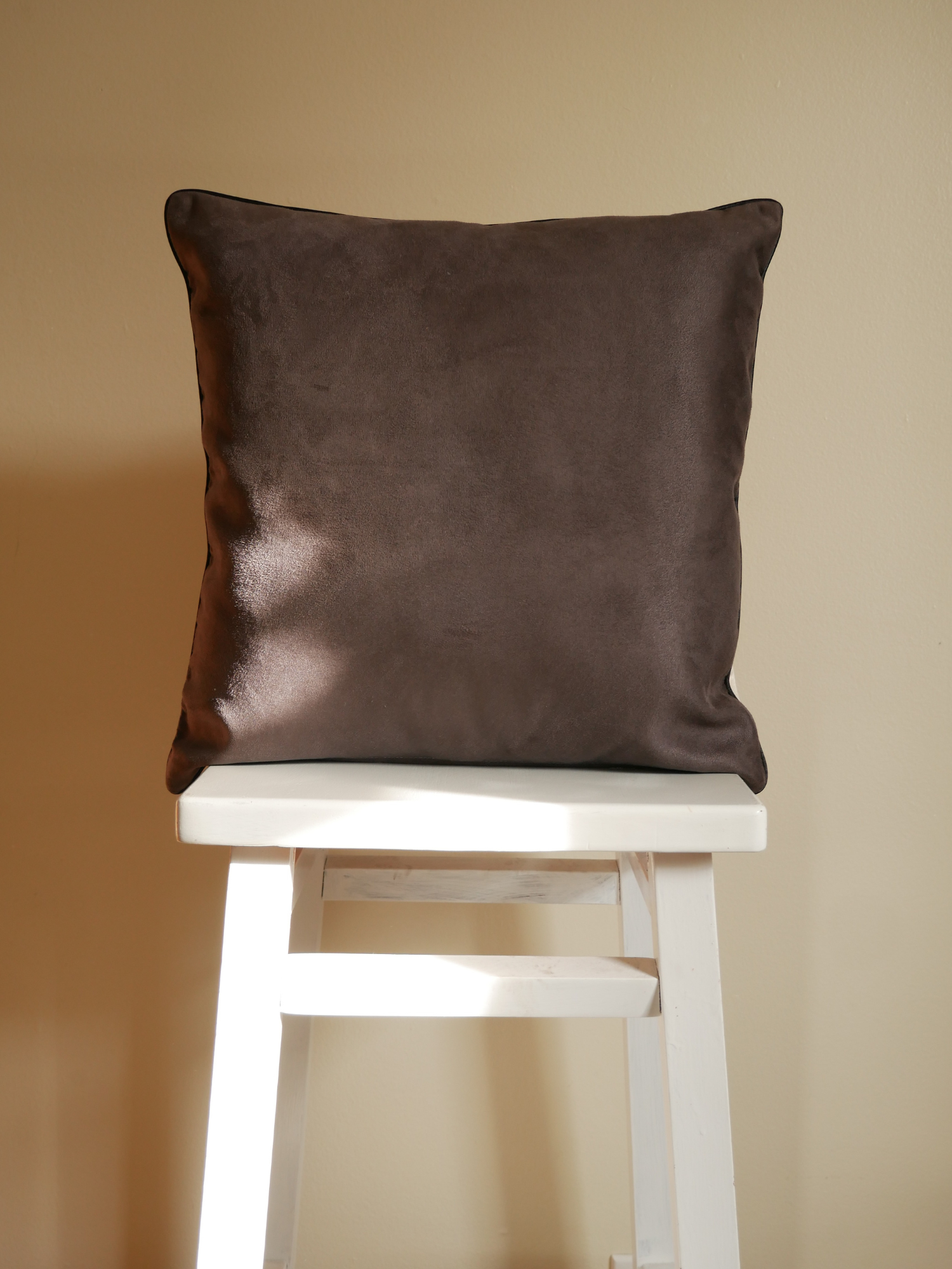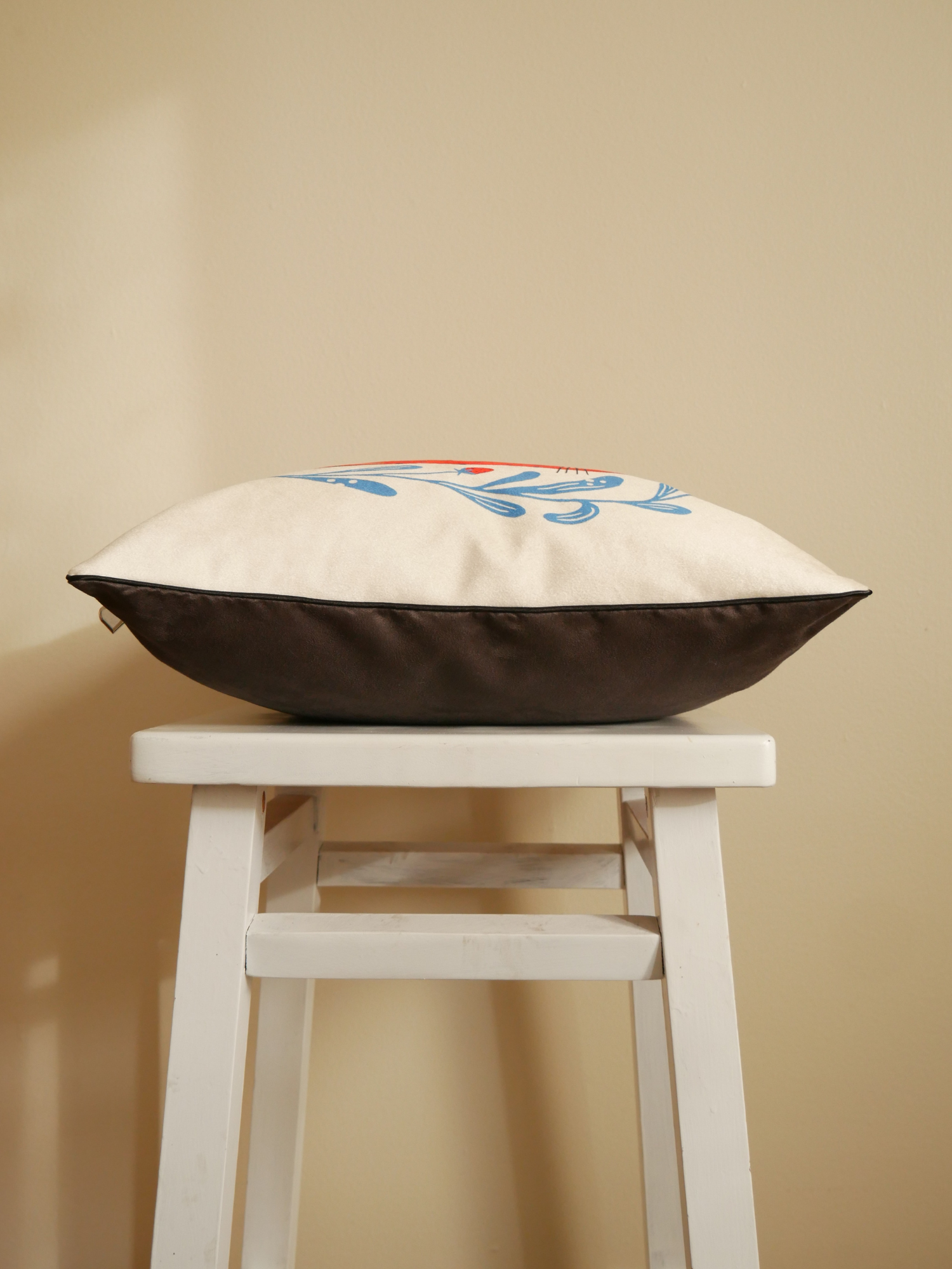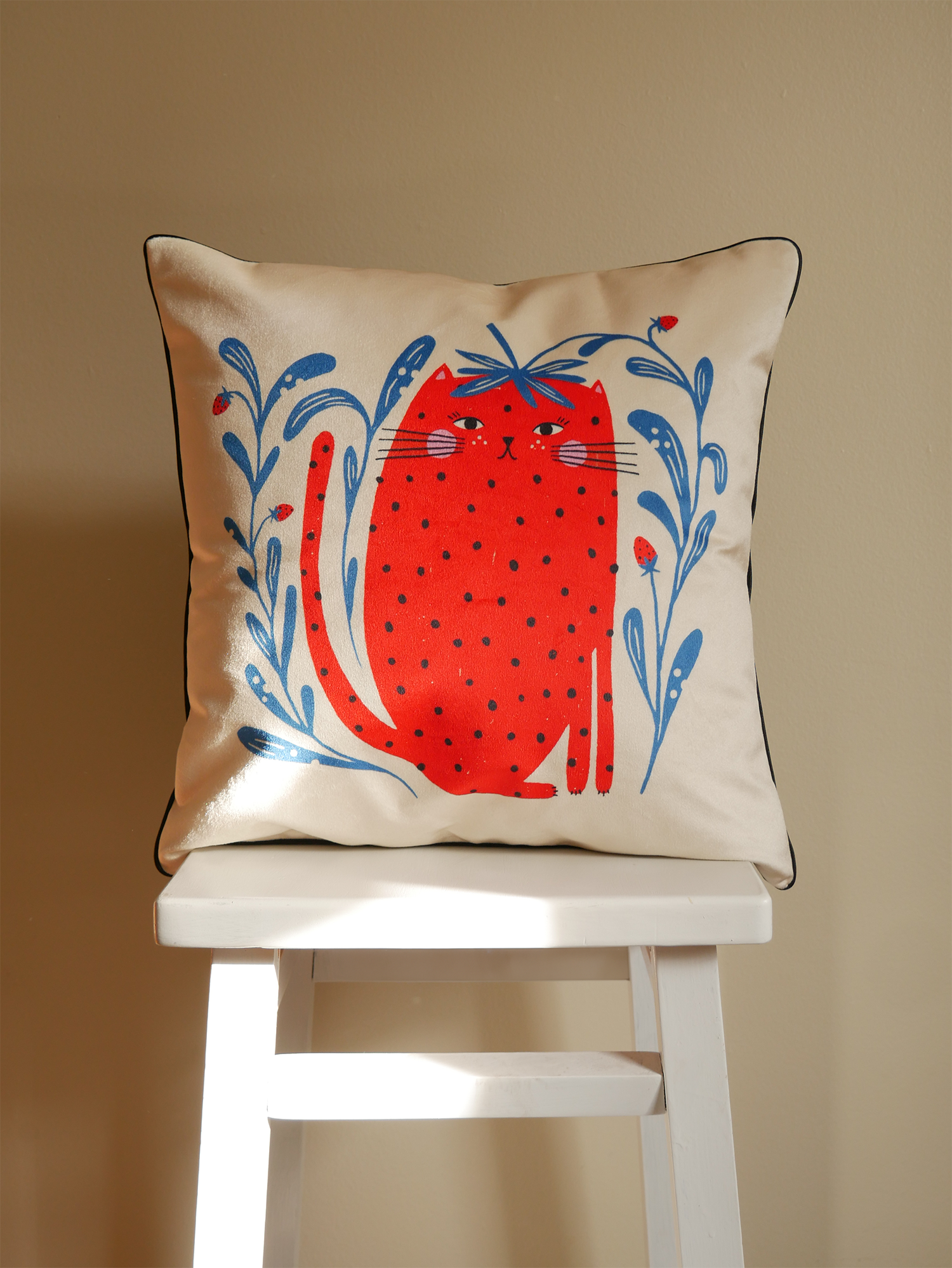 Add whimsy to your space with Kenzie Elston's charming strawberry cat design. Classic black piping and rich charcoal suede backing create a stylish frame, while the heart zipper adds adorable charm.